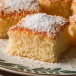 Buttermilchkuchen mit Kokos auf einem Teller, dekoriert mit Kokosraspeln.