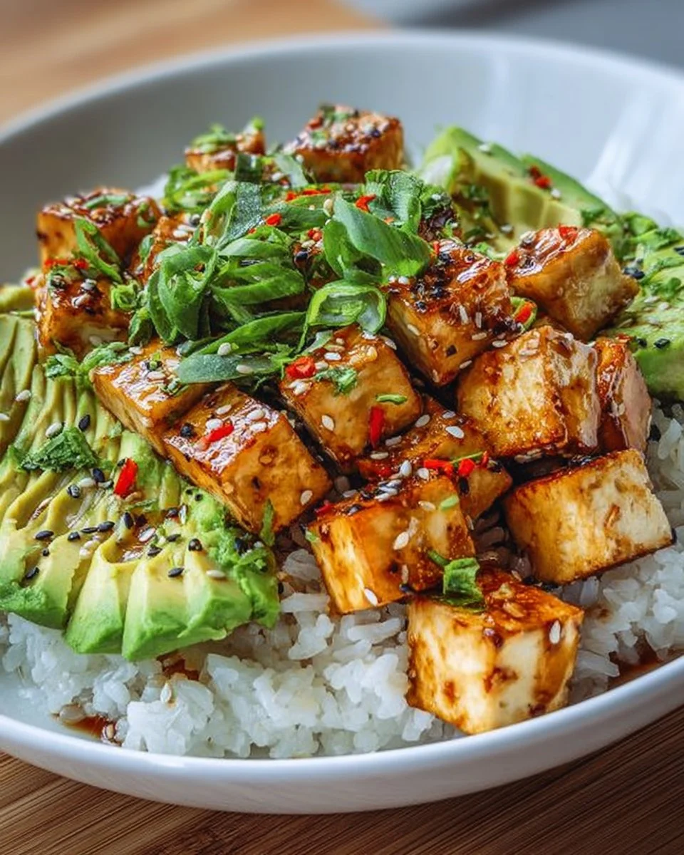 Eine köstliche Bowl mit cremiger Avocado, knusprigem Tofu und duftendem Jasminreis, perfekt für jede Gelegenheit.