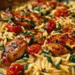 Eine köstliche, cremige Hähnchen Orzo Pfanne, die mit frischen Zutaten und voller Aromen überzeugt und perfekt für ein gemütliches Abendessen ist.