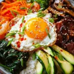 Stell dir vor, du sitzt an einem einladenden Tisch, dein Lieblingsessensgeschirr vor dir, während du die leuchtenden Farben des Bibimbap bewunderst: das leuchtende Orange der Karotten, das strahlende Grün der Zucchini und Spinat, verbunden mit den dunklen, tannengrünen Shiitake-Pilzen. Die erste Gabel lässt die Aromen explodieren und die Texturen entfalten sich; der Reis ist fluffig, das Gemüse knackig, während das Spiegelei darüber einen sanften, cremigen Kontrast bietet. Dieses Gericht ist nicht nur optisch, sondern auch geschmacklich ein wahrer Festschmaus.