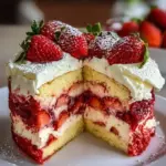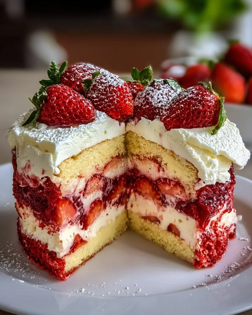 Ein bunter, fruchtiger Kuchen mit cremiger Füllung aus Erdbeeren und Frischkäse, ideal für jede Festlichkeit.