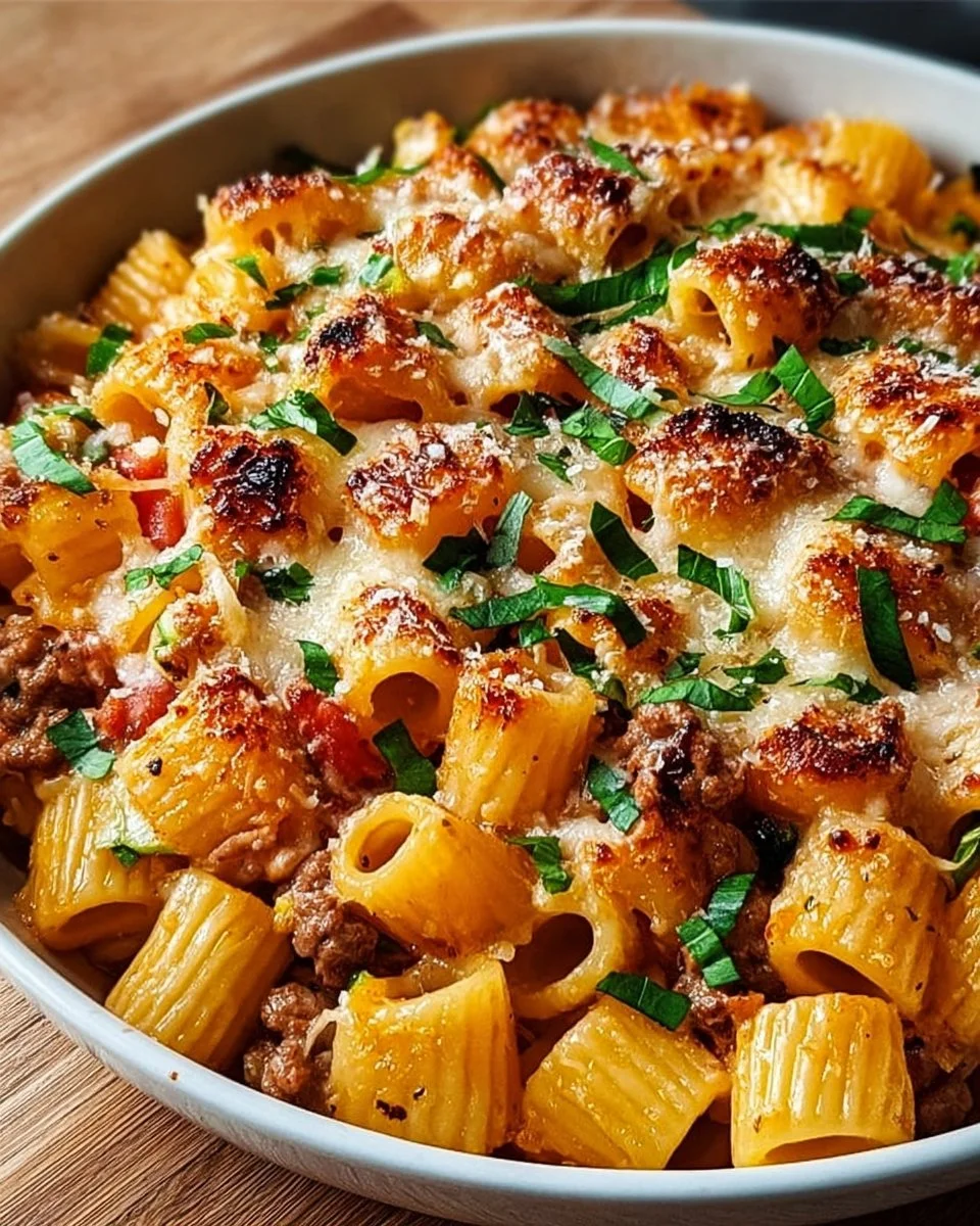 Ein herzhaftes Gericht mit gemischtem Hackfleisch, frischem Gemüse und geschmolzenem Käse, perfekt für Familie und Freunde.