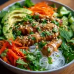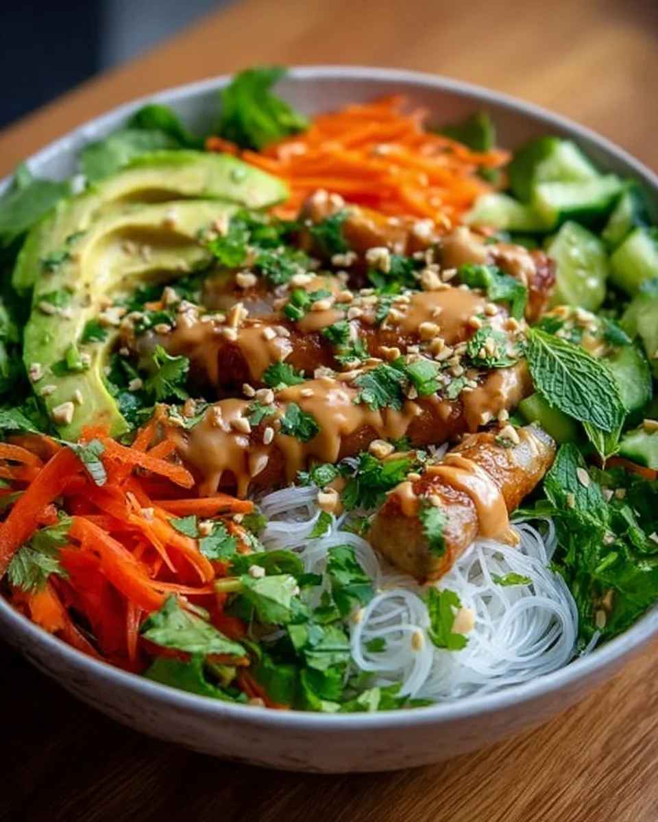 Lassen Sie sich von diesem erfrischenden Frühlingsrollen-Salat begeistern! Die Kombination aus knackigem Gemüse, cremiger Avocado und dem unverwechselbaren Erdnuss-Dressing macht jeden Bissen zu einem Fest der Sinne. Egal, ob für ein unkompliziertes Mittagessen oder als Highlight bei Ihrer nächsten Zusammenkunft – dieser Salat sollte ganz oben auf Ihrer Liste stehen. Nehmen Sie sich die Zeit, ihn zuzubereiten, und lassen Sie sich von dem Geschmack und der Textur dieser wunderbaren Kreation verzaubern. Tauchen Sie ein in die Vielfalt der Aromen und genießen Sie jeden köstlichen Bissen!