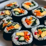 Gemüse-Gimbap bringt eine Fülle von Vorteilen mit sich, die den Gaumen verwöhnen und die Seele nähren. Dieses Gericht ist nicht nur ein Fest der Farben und Aromen, sondern auch eine gesunde Wahl. Die Kombination aus frischem Gemüse und dem Energielieferanten Reis macht es zu einer nährstoffreichen Mahlzeit. Außerdem lässt es sich kinderleicht anpassen. Du kannst deine liebsten Zutaten hinzufügen oder bestimmte Teile weglassen, je nach Geschmack und Vorlieben.