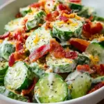 Der Gurkensalat mit Speck und Käse entzückt nicht nur den Gaumen, sondern zaubert auch ein Lächeln auf jedes Gesicht. Mit seiner erfrischenden Kombination aus knackigen Gurken, herzhaftem Speck und cremigem Käse belohnt er jeden Bissen mit einem harmonischen Geschmack. Lass dich inspirieren, diese köstliche Beilage zu kreieren und bring die Freude am Essen auf deine nächste Zusammenkunft! Gönne dir und deinen Lieben diesen Genuss – du wirst ihn garantiert lieben!