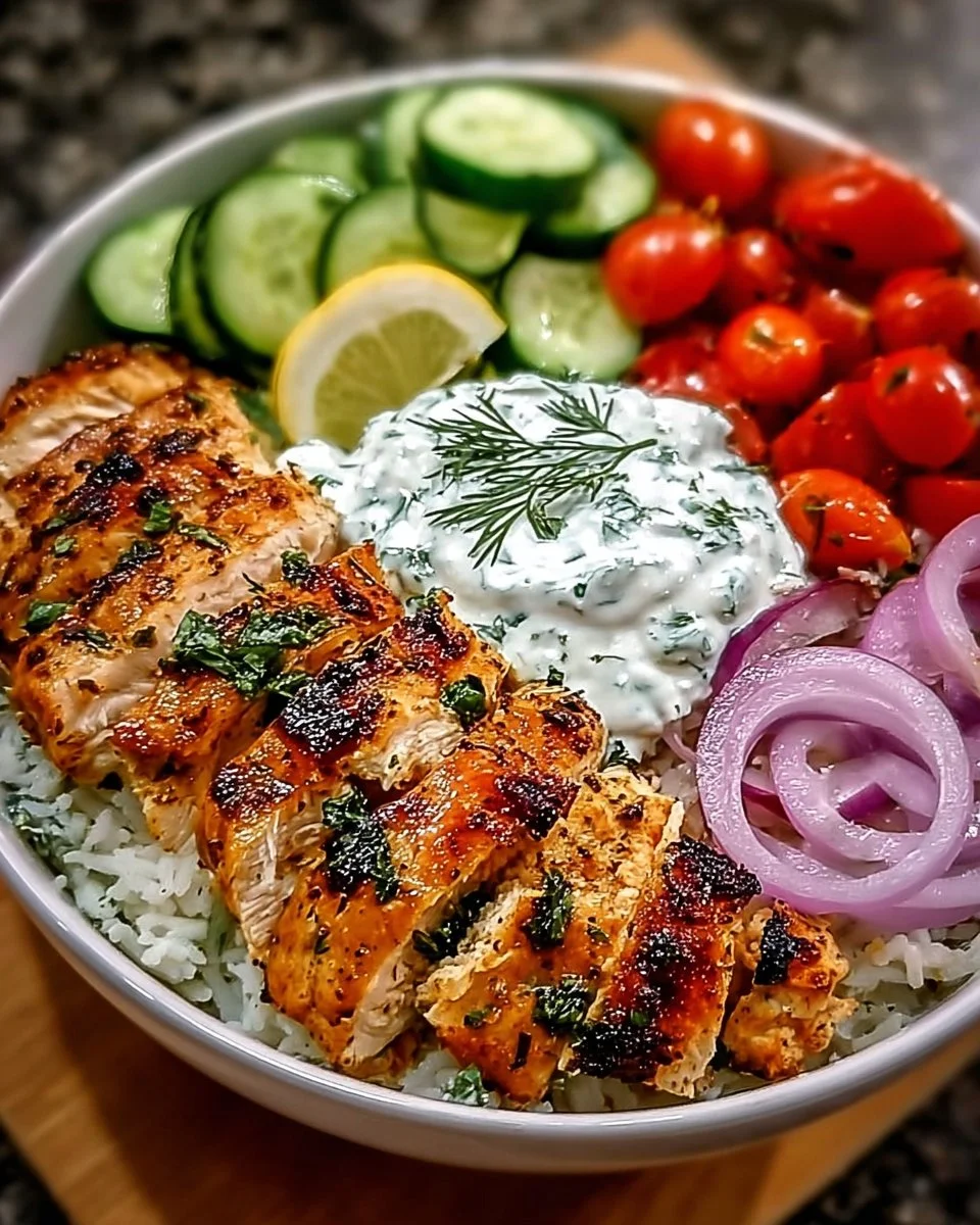 Eine köstliche Hähnchen-Reisbowl mit frischen Zutaten und cremigem Tzatziki, perfekt für jede Gelegenheit.