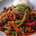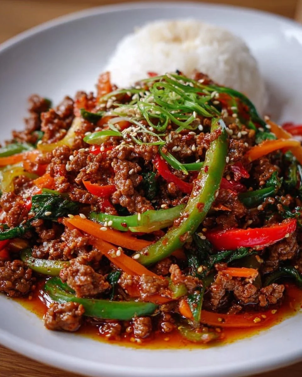 Koreanische Hackfleischpfanne vereint die Aromen und Texturen der koreanischen Küche auf eine artgerechte, herzliche Art und Weise. Stellen Sie sich vor, wie Sie durch die Küchenluft wärmende Noten von geröstetem Sesamöl und frischem Knoblauch atmen. Das zarte, angebratene Hackfleisch legt sich in saftigen, goldbraunen Hügeln auf eine bunte Mischung aus frisch geschnittenem Gemüse. Die Karotten und Paprika bieten einen knackigen Biss, während die Frühlingszwiebeln eine spritzige Frische hinzufügen. Jedes Gericht wird durch die harmonische Kombination von Sojasauce und scharfer Soße lebendig, die auf der Zunge tanzt und den Gaumen umarmt.