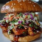 Ein saftiges BBQ-Hähnchen-Sandwich, mariniert in einer würzigen Mischung aus Sojasauce und Gochujang, begleitet von einem knusprigen Slaw.