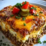 In einem gemütlichen Ambiente, in der Luft schwebt der verführerische Duft von geschmolzenem Käse und saftigem Rinderhack — das ist der Moment, in dem der Low Carb Cheeseburger Auflauf zum Geschmackserlebnis wird. Dieses herzliche Gericht lädt nicht nur zum Schlemmen ein, sondern ist auch ein Fest für die Sinne. Jeder Bissen verspricht die köstliche Kombination von würzigem Hackfleisch, aromatischen Zwiebeln und dem kräftigen Charakter von Tomaten, alles umhüllt von einer cremigen Käseschicht, die sich zart auf der Zunge zergeht. Der Auflauf glänzt golden und verführerisch aus dem Ofen und bietet somit den perfekten Auftakt für ein Familienessen oder ein geselliges Beisammensein.
