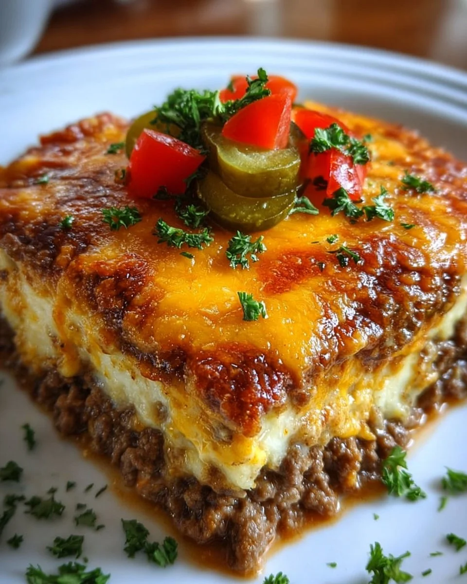 Ein herzlicher Low Carb Cheeseburger Auflauf mit saftigem Rinderhack und geschmolzenem Käse, der Aromen eines klassischen Cheeseburgers einfängt.