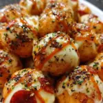 Leckere, knusprige Pizza Bällchen gefüllt mit Mozzarella, Salami und Oliven, perfekt für gesellige Anlässe.
