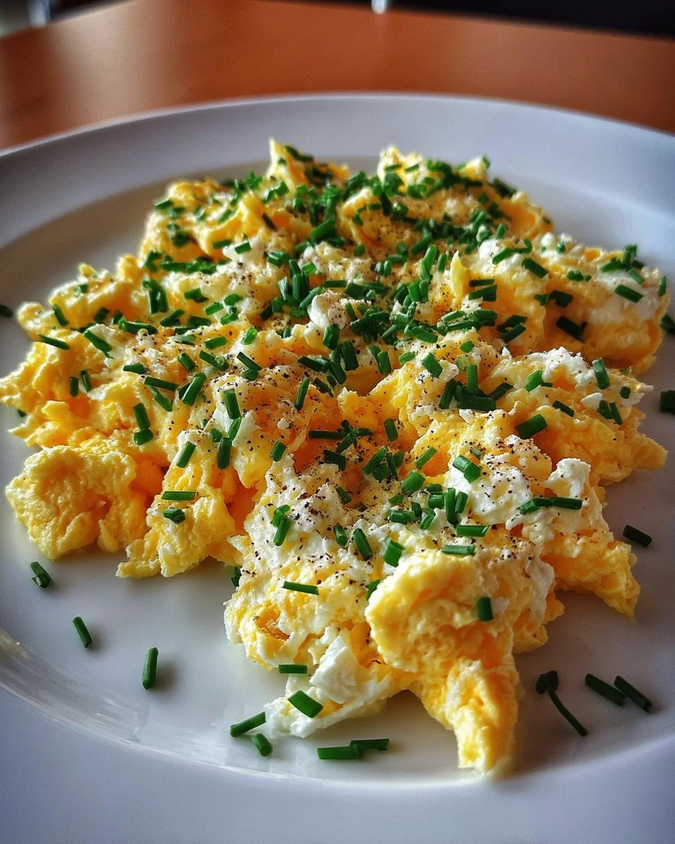 Ein herzhaftes und cremiges Rührei mit Hüttenkäse und frischen Kräutern, ideal für ein schnelles Frühstück oder als leckeres Brunch-Gericht.