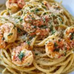 Eine köstliche Kombination aus zarten Garnelen und cremiger Sauce, serviert mit al dente Spaghetti.