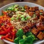 Eine köstliche und nahrhafte vegane Teriyaki-Nudel-Bowl mit zartem Tofu, frischem Gemüse und einer aromatischen Teriyaki-Sauce.